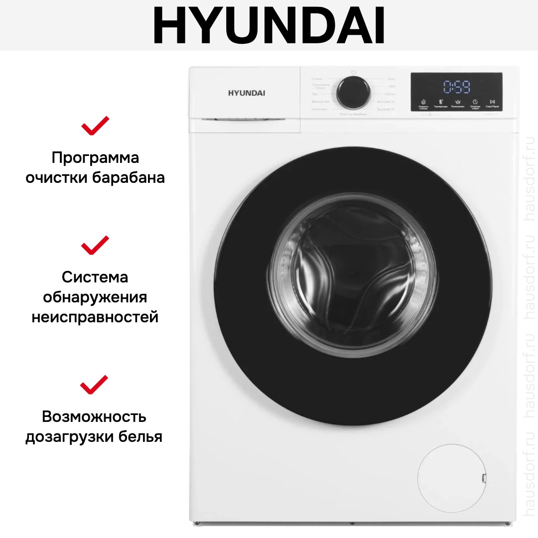 Стиральная машина Hyundai WME8212. Ее лаконичный дизайн сочетает белый корпус и черный люк, что делает прибор универсальным для большинства интерьеров. Компактные габариты 84.5×59.8×45 см позволяют установить устройство даже в помещениях с ограниченным пространством. Наклонная панель управления улучшает видимость и сокращает наклоны при выборе режимов. Диаметр загрузочного люка 50 см обеспечивает удобную загрузку и выгрузку громоздких вещей.