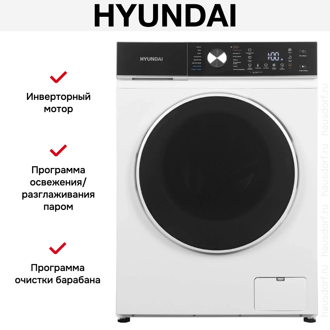 Стирально-сушильная машина HYUNDAI WFD8216 — практичное устройство для дома с фронтальной загрузкой. Белый корпус дополняет черный люк 47,2 см; угол открытия 150° и глубина с распахнутой дверцей 103 см упрощают укладку текстиля. Наклонная панель с электромеханическим управлением объединяет сенсорные кнопки и поворотный селектор, а цифровой дисплей показывает оставшееся время, активные опции, стадию сушки, уровень загрязнения, отсрочку и блокировку от детей. Барабан из нержавеющей стали бережно обращается с вещами. Лоток на три секции удобен для дозирования моющих составов.