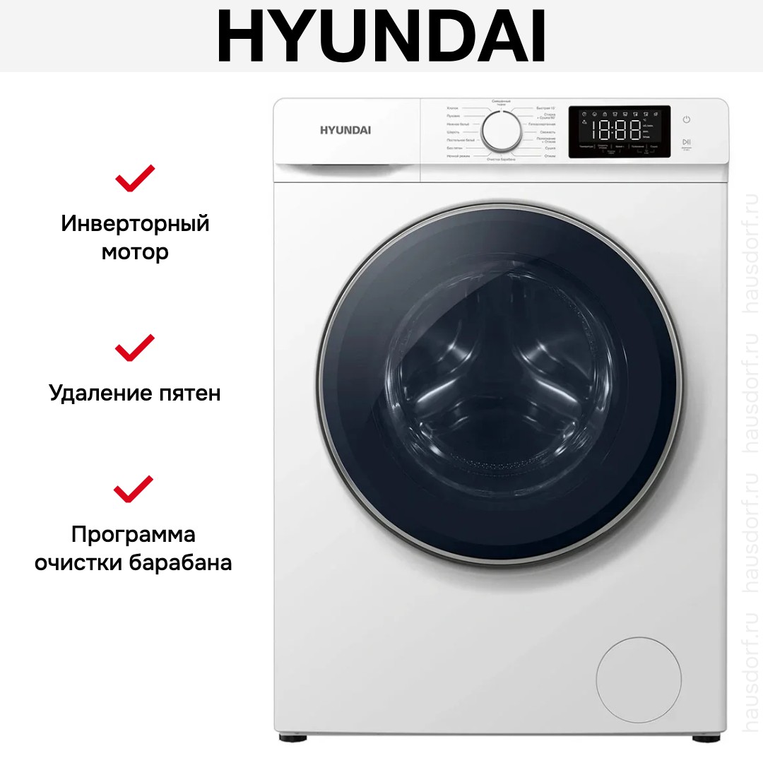 Для дома, Hyundai, Стирально-сушильная машина Hyundai WFD9212. Внешний вид сочетает лаконичную белую кузовную отделку с контрастным черным люком, что делает устройство универсальным для любого интерьера. Компактные габариты 85×60×61 см рассчитаны на стандартные ниши и не требуют дополнительного визуального пространства. Диаметр загрузочного окна 33 см и угол открывания 170° обеспечивают удобство загрузки даже объемных вещей без наклонов и перестановок.