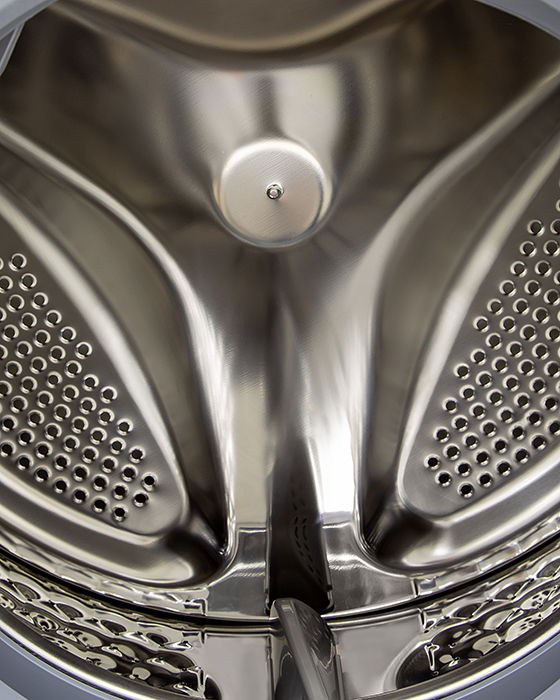 Барабан обычно изготавливается из тонкой нержавеющей стали, отверстия на боковой поверхности могут располагаться по-разному и иметь разную форму. Поверхность барабана в большинстве моделей не является гладкой: на ней находятся выпуклости и впадины для лучшего скольжения белья.