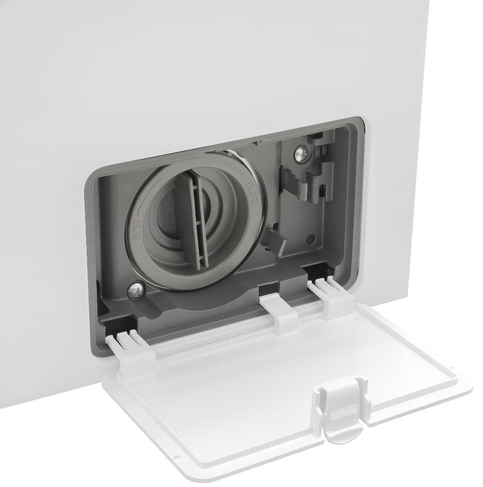 Модели с вертикальной загрузкой отличает надежное крепление барабана на двух валах. Еще одно их отличие — особая конструкция люка: на нем имеется отверстие, закрывающееся на замок. Чтобы получить доступ к барабану, необходимо открыт его и отодвинуть створку.