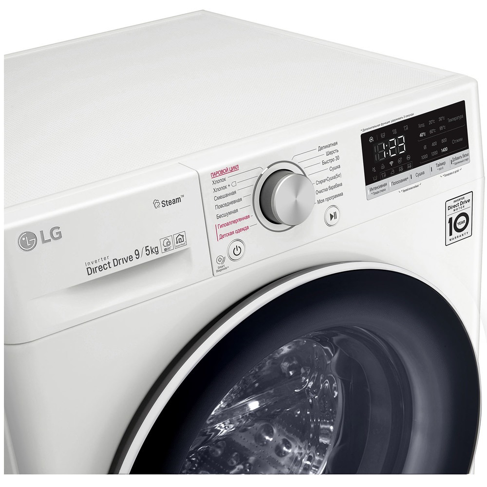 Эта модель — комбинация стирки и сушки, что полезно людям, которые не могут или не хотят приобретать отдельно сушильную машину, при этом в квартире нет балкона или лоджии, чтобы с комфортом сушить одежду на веревках. Вы можете отложить запуск, если хотите сэкономить на тарифах и включить машинку ночью, либо если планируете развесить белье сразу после возвращения работы и не ждать, пока закончится цикл. На панели управления отображаются разнообразные индикаторы, чтобы было проще следить за процессом, например: хода программы, температуры стирки, скорости отжима, выбранной программы, времени сушки, включения и выключения, старт/пауза. Скорость отжима достигает 1400 оборотов в минуту. Функцию отжима можно будет отключить вручную, если она вам не нужна.
