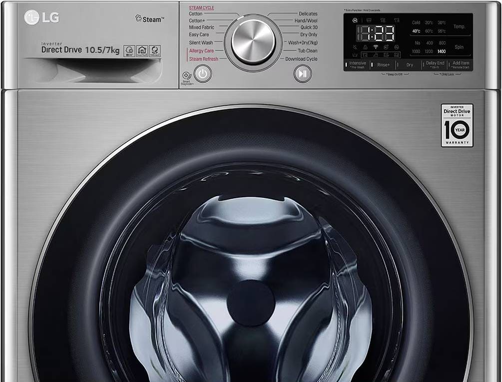 Эта модель — комбинация стирки и сушки, что полезно людям, которые не могут или не хотят приобретать отдельно сушильную машину, при этом в квартире нет балкона или лоджии, чтобы с комфортом сушить одежду на веревках. Вы можете отложить запуск, если хотите сэкономить на тарифах и включить машинку ночью, либо если планируете развесить белье сразу после возвращения работы и не ждать, пока закончится цикл. На панели управления отображаются разнообразные индикаторы, чтобы было проще следить за процессом, например: хода программы, температуры стирки, скорости отжима, времени до окончания стирки, выбора дополнительных функций, блокировки дверцы, сушки, отсрочки старта, дополнительного полоскания. Скорость отжима достигает 1400 оборотов в минуту. Функцию отжима можно будет отключить вручную, если она вам не нужна.