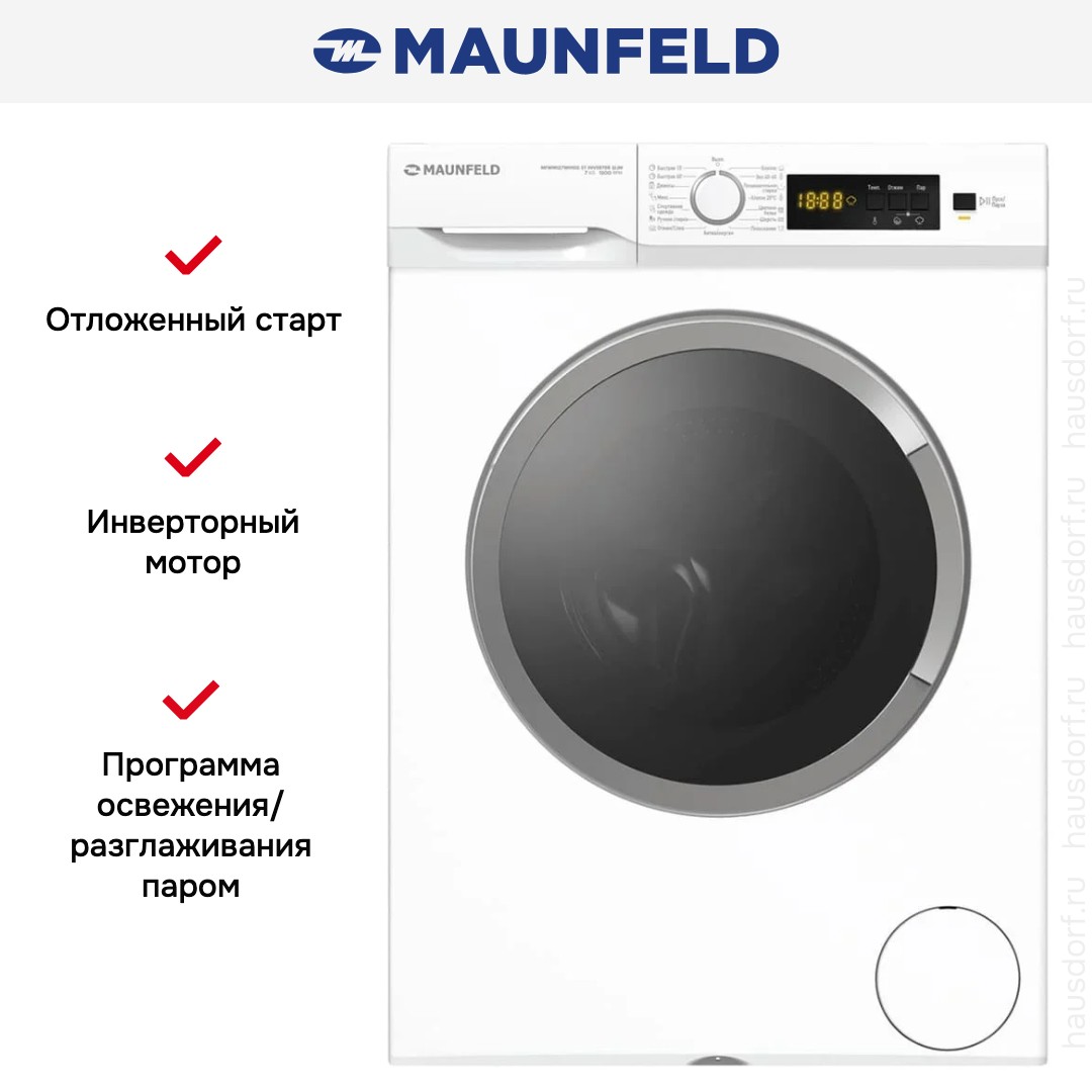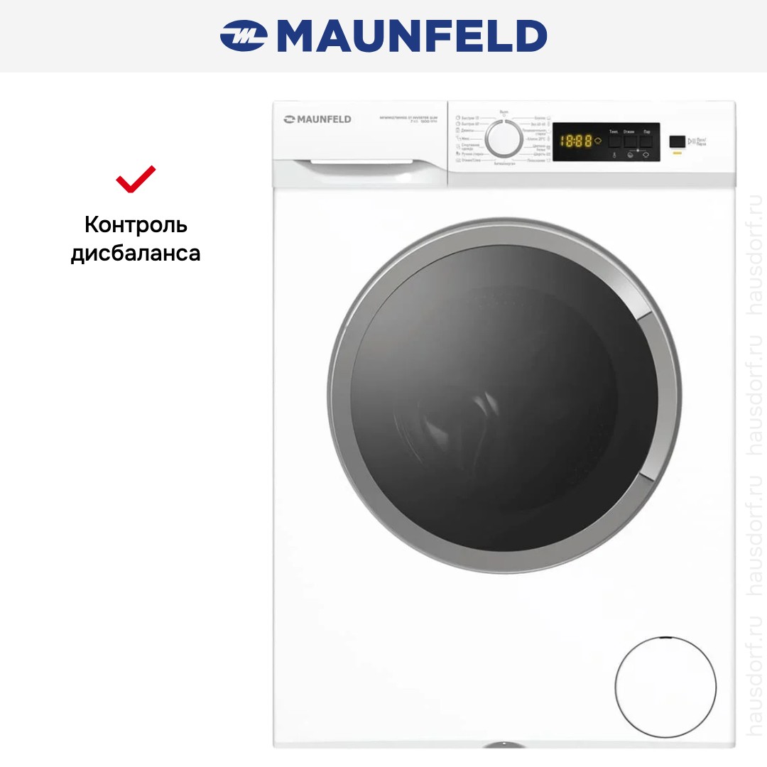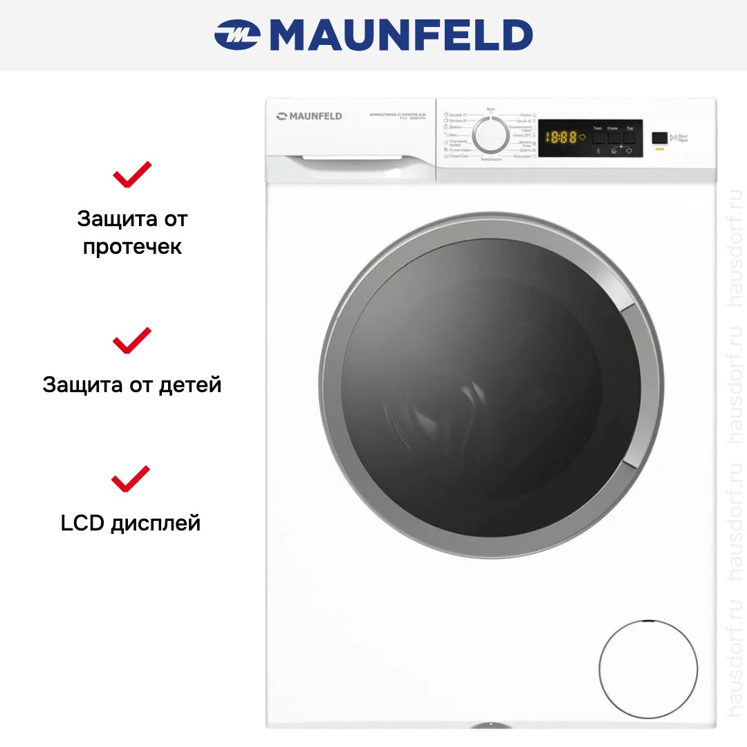 Стиральная машина Maunfeld MFWM127WH100 ST Inverter Slim. Элегантный белый корпус с минималистичной фронтальной панелью впишется в интерьер любой ванной или кухни. Компактная глубина 53,5 см позволяет разместить прибор в узких нишах, а стандартная высота 85 см сохраняет удобство загрузки и выгрузки белья. Ножки с регулировкой высоты помогают выровнять устройство на неровном полу и уменьшить вибрации при отжиме.