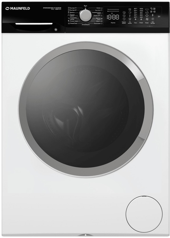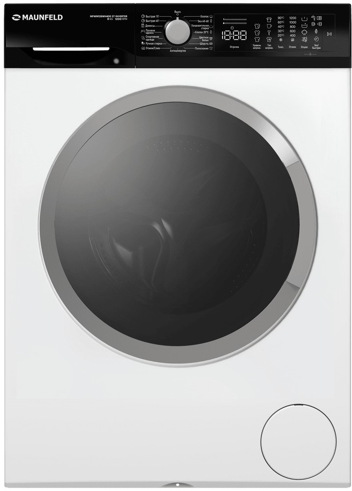 Стиральная машина Маунфилд MFWM128WH400 ST INVERTER выпущена в стандартной конфигурации — устанавливается отдельно, поэтому рекомендуем заранее выделить для нее место в квартире. Благодаря классической фронтальной загрузке она привычна и удобна даже для тех, кто не очень разбирается в технике. За счет небольшой глубины данную модель предпочитают владельцы небольших квартир, студий. Вместительность барабана средняя, поэтому ее хватит и для одиночек, и для семей с детьми. Максимальная загрузка: 8 кг.