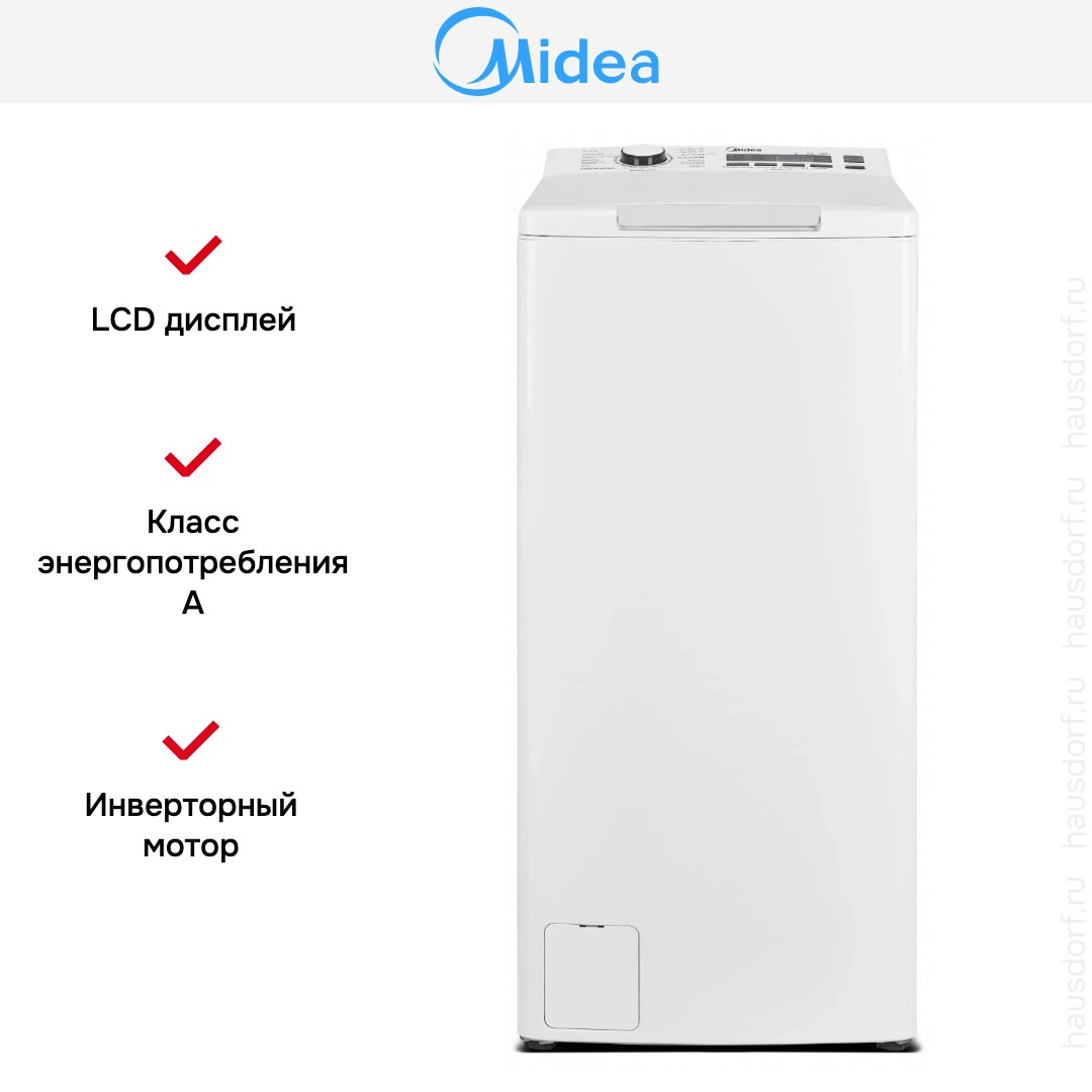 Стиральная машина Midea MFE12W75B-W — компактный бытовой прибор для дома с вертикальной загрузкой и лаконичным белым корпусом, созданный для комфортной стирки в ограниченном пространстве. Ее габариты 87.5×40×59 см и высота 87.5 см позволяют разместить агрегат в нише или рядом с мебелью, а узкая ширина делает модель удобной для коридоров и маленьких прачечных. Отдельностоящая конструкция обеспечивает простую установку без необходимости встраивания, а вес 56 кг говорит о надежности каркаса и устойчивости при работе.