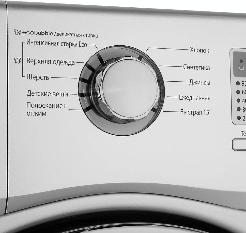 После основного этапа следует не менее трех-четырех циклов полоскания в большом количестве воды для удаления малейших следов моющего средства, а затем отжим на максимальной скорости. Допускается корректировка параметров, установленных в программе по умолчанию — например, снижение температуры для стирки цветных вещей или одежды с отделкой. Выбрать программу можно при помощи поворотного регулятора или кнопок на панели управления.
