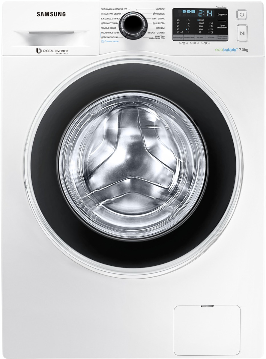 Цвет этой стиральной машинки — белый. В данной модели Samsung используется барабан Diamond. Мотор: Инверторный. Благодаря ему машина работает тише, потребляет меньше электроэнергии, сохраняя при этом необходимую мощность.