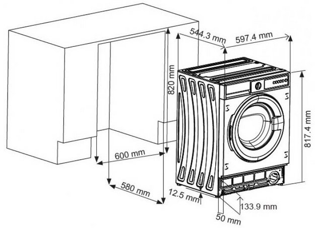 В отличие от другой встраиваемой техники, круглая дверца стиральных машин редко крепится к мебельному фасаду, она способна открываться отдельно. При размещении требуется оставлять зазор между задней стенкой машины и стеной помещения для свободного размещения шлангов. Нижняя часть стиралки закрывается цоколем, а верхняя — столешницей: крышку машины при этом иногда можно снять.
