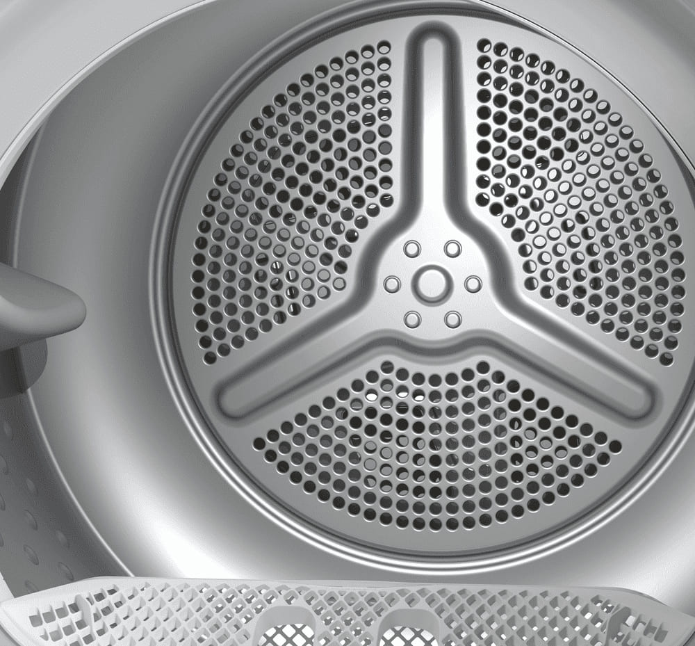 - Тепловой насос — поступающий внутрь воздух нагревается, что ускоряет и улучшает эффективность сушки. Затем он проходит через конденсационный отдел, отдает влагу и сухим повторно возвращается в барабан.