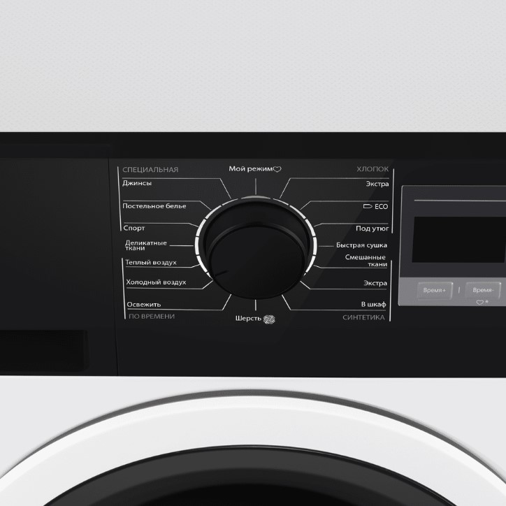 Элементы на панели управления сушильной машины служат для выбора программы сушки, для регулировки параметров работы, для задания дополнительных опций. Большинство сушильных маши оборудовано поворотными переключателями: с их помощью можно легко выбирать программу сушки — по остаточной влажности, по типу ткани, по виду изделий, по времени. Кнопки предназначаются для добавления к программе дополнительных опций: они могут быть как обычными, так сенсорными — в последнем случае все варианты выбора отображаются на дисплее, и возможности управления становятся более удобными и гибкими.