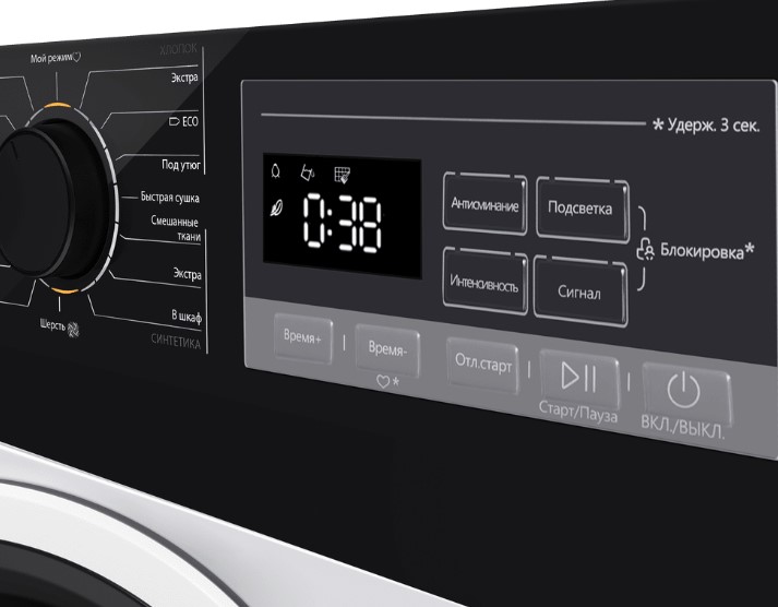 Электронное управление удобно и понятно для людей разного поколения. Контролировать процесс можно с помощью дисплея, на который выводится основная информация. Вы можете использовать таймер, чтобы отложить запуск на подходящее время. Когда машинка прекратит работу, вы услышите специальный сигнал. Другие полезные опции, которые помогут вам: сенсор влажности.