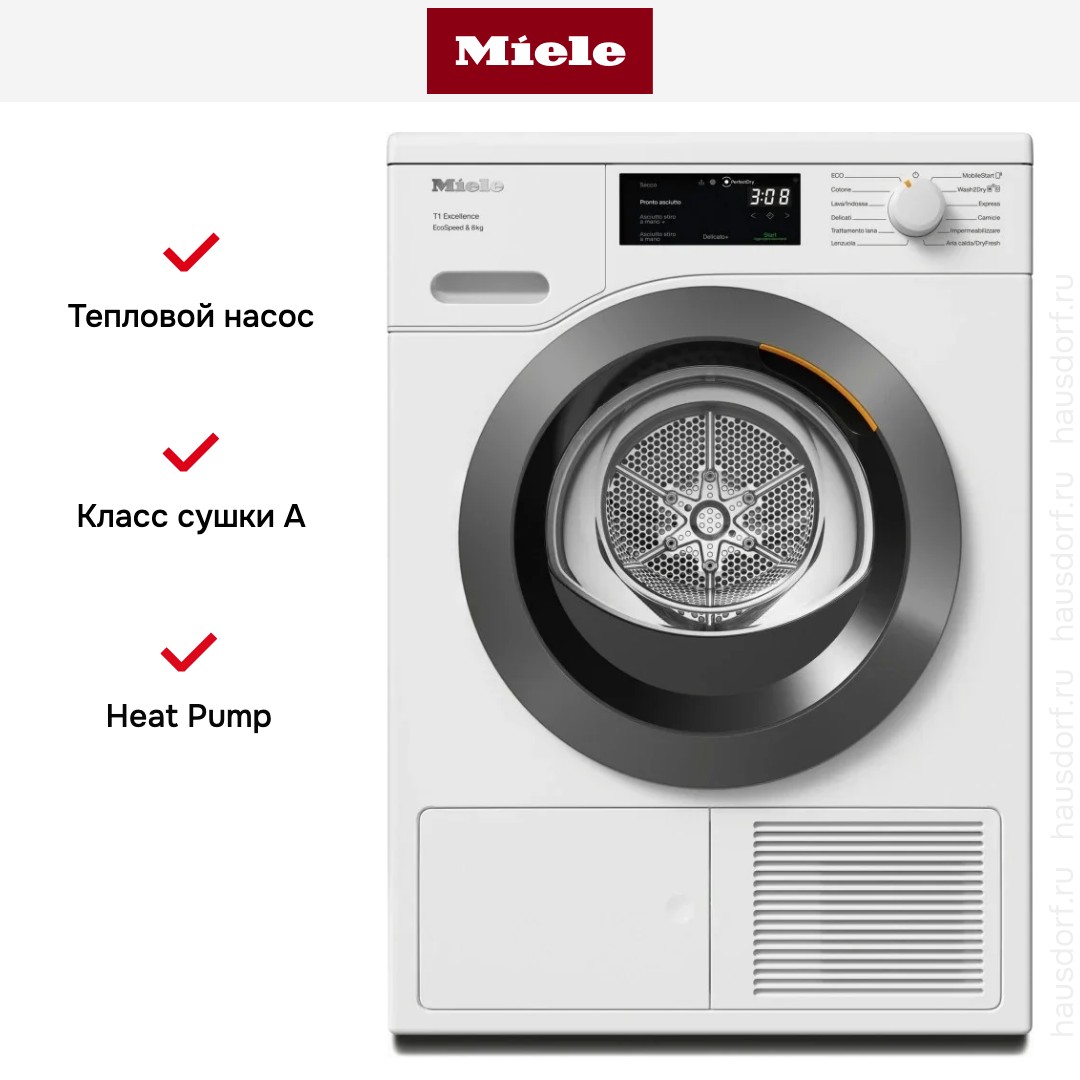 Запатентованная гарантирует согласованную работу и автоматическую очистку теплообменника и фильтра, так что пользователю не нужно беспокоиться и следить за степенью засорения теплообменника ворсом, а затем извлекать и прочищать его вручную, что также занимает значительное время. Таким образом удается поддерживать короткие рабочие циклы для сушки белья из ткани любого вида, а значит, и экономить электроэнергию: срок службы машины при этом не имеет значения. Все сушильные машины Miele, оснащенные технологией EcoDry, относятся к наивысшему классу энергоэффективности А+++.