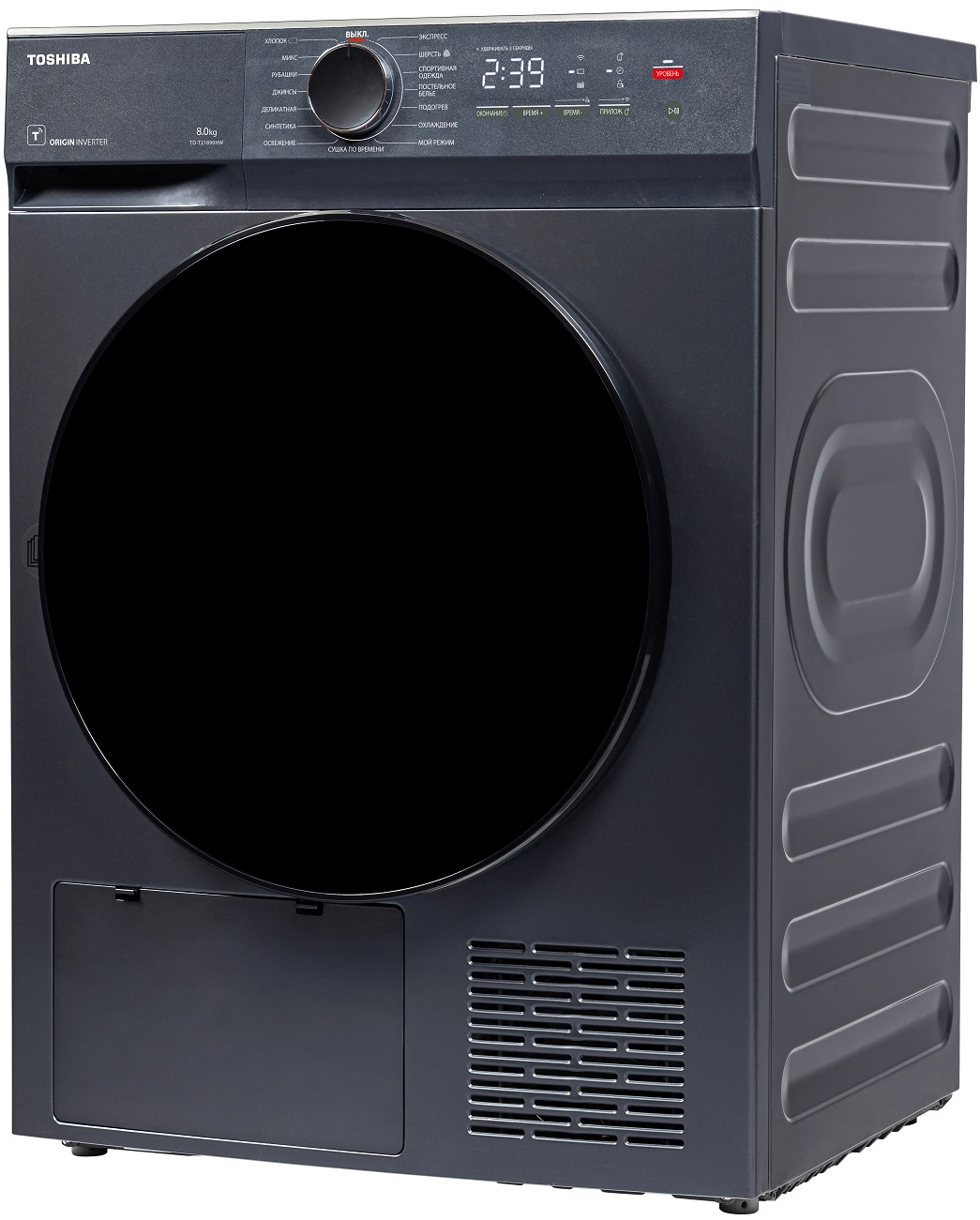 В барабан единовременно можно загрузить 8 кг. Подсветка — не только красивая, но и функциональная деталь, так как дает хороший обзор, как проходит сушка. Цвет корпуса — темно-серый.