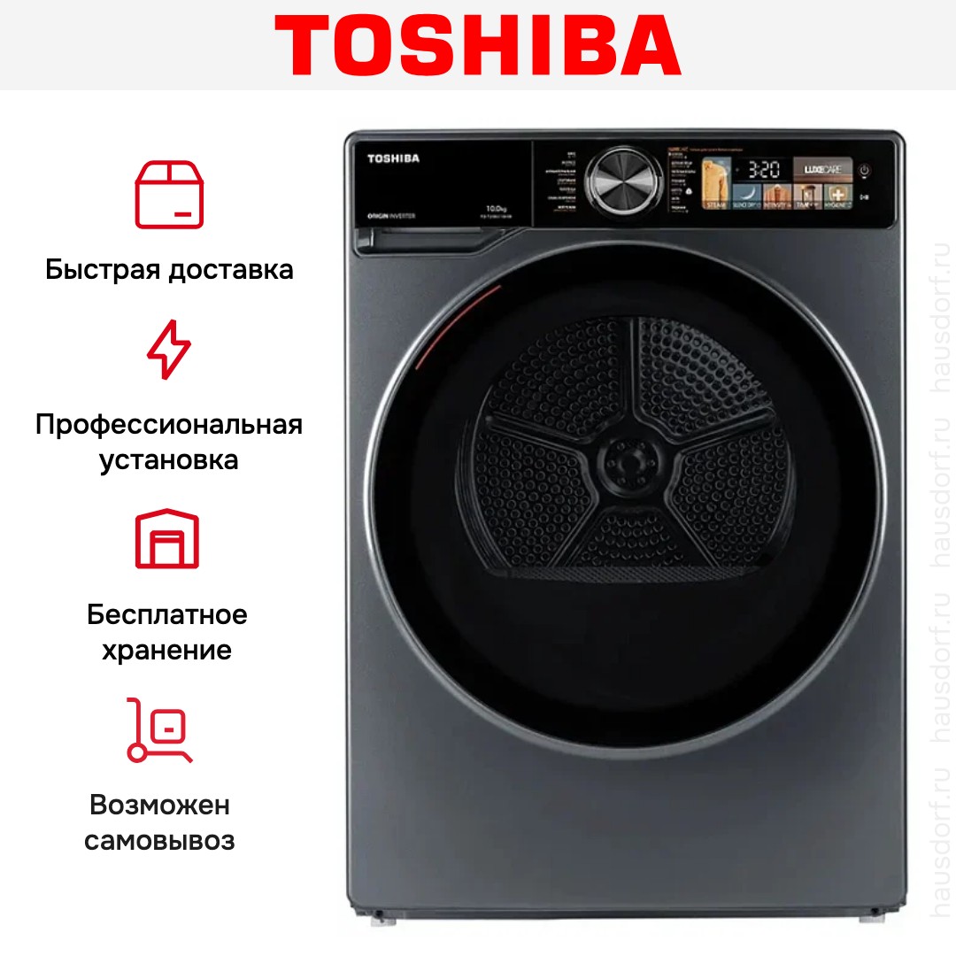 Сушильная машина Toshiba предназначена для домашнего использования, поэтому имеет стандартные габариты и большое разнообразие программ. Так как она устанавливается отдельно, нужно заранее найти достаточно места в помещении.