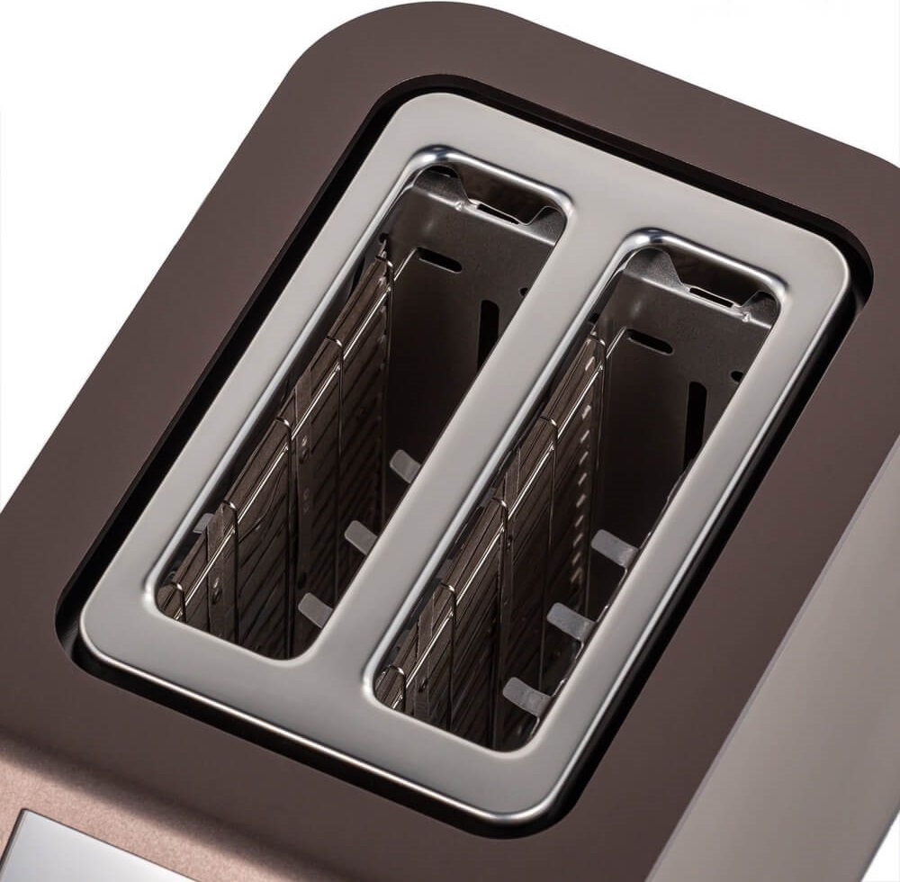 Управление тостером осуществляется с помощью интуитивно понятной электронной системы, сочетающей кнопочные и ползунковые элементы, что обеспечивает плавную и точную настройку параметров приготовления. Наличие цифрового дисплея позволяет визуально контролировать выбранный режим и время поджаривания, а индикация включения сигнализирует о готовности устройства к работе. Благодаря такому оснащению пользователь может полностью контролировать процесс — от лёгкого подсушивания до насыщенного хрустящего румянца.