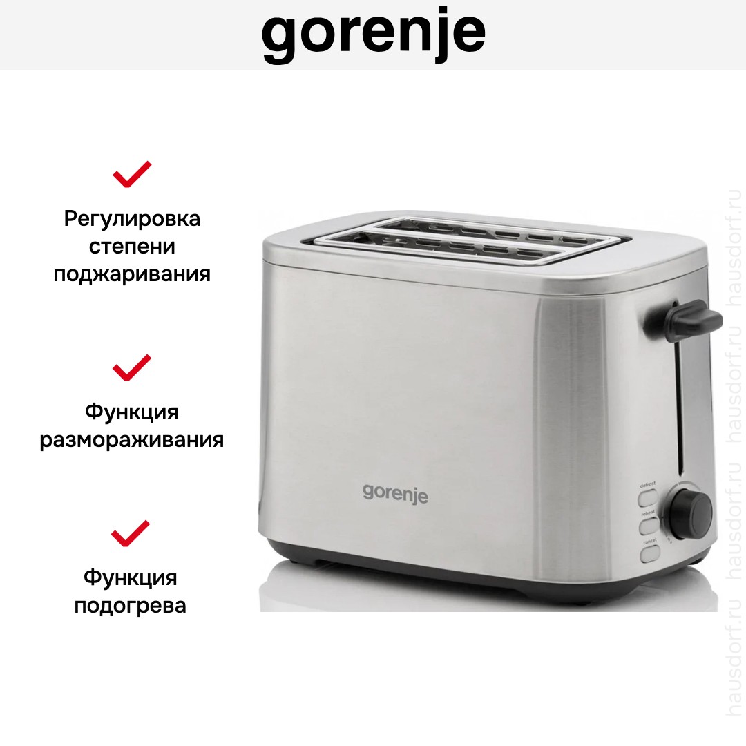Стильный тостер Gorenje имеет компактный корпус на устойчивых ножках, благодаря которым не пошатывается, даже если хлеб выпрыгивает вверх в конце приготовления. Основной материал, из которого изготовлен прибор, — пластик. Его главный оттенок — нержавеющая сталь. Простое и понятное механическое управление позволяет быстро разобраться во всех функциях. Простое и понятное электронное управление позволяет быстро разобраться во всех функциях. На корпусе расположены кнопочные+поворотные переключатели для изменения настроек.