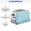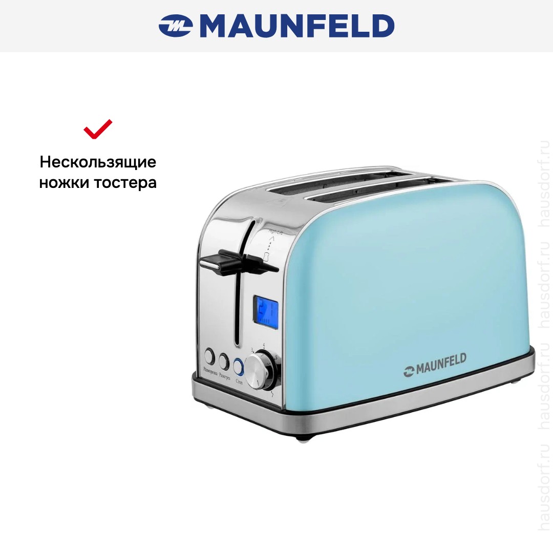 Стильный тостер Maunfeld имеет компактный корпус на устойчивых ножках, благодаря которым не пошатывается, даже если хлеб выпрыгивает вверх в конце приготовления. Основной материал, из которого изготовлен прибор, — нержавеющая сталь. Его главный оттенок — голубой. Простое и понятное механическое управление позволяет быстро разобраться во всех функциях. Простое и понятное электронное управление позволяет быстро разобраться во всех функциях. На корпусе расположены кнопочные+поворотные переключатели для изменения настроек. Благодаря небольшому дисплею еще удобнее следить за процессом.