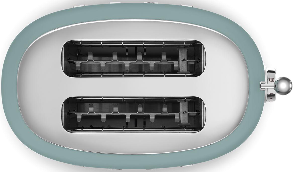 Стильный тостер Smeg имеет компактный корпус на устойчивых ножках, благодаря которым не пошатывается, даже если хлеб выпрыгивает вверх в конце приготовления. Основной материал, из которого изготовлен прибор, — нержавеющая сталь. Его главный оттенок — изумрудный. Простое и понятное механическое управление позволяет быстро разобраться во всех функциях. Простое и понятное электронное управление позволяет быстро разобраться во всех функциях. На корпусе расположены кнопочные переключатели для изменения настроек.