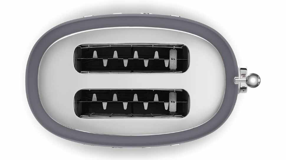 Тостер Smeg TSF01GREU — стильный бытовой прибор, который соединяет винтажный облик 50-х с современным набором функций. Корпус из нержавеющей стали в матовом сером цвете дополняют полированные хромированные панели сверху и в основании. Компактные габариты 19.8—20×31×19.5 см и масса 2,4 кг делают его удобным для расположения на любой кухонной поверхности. Ширина с рычагом управления составляет 325 мм.