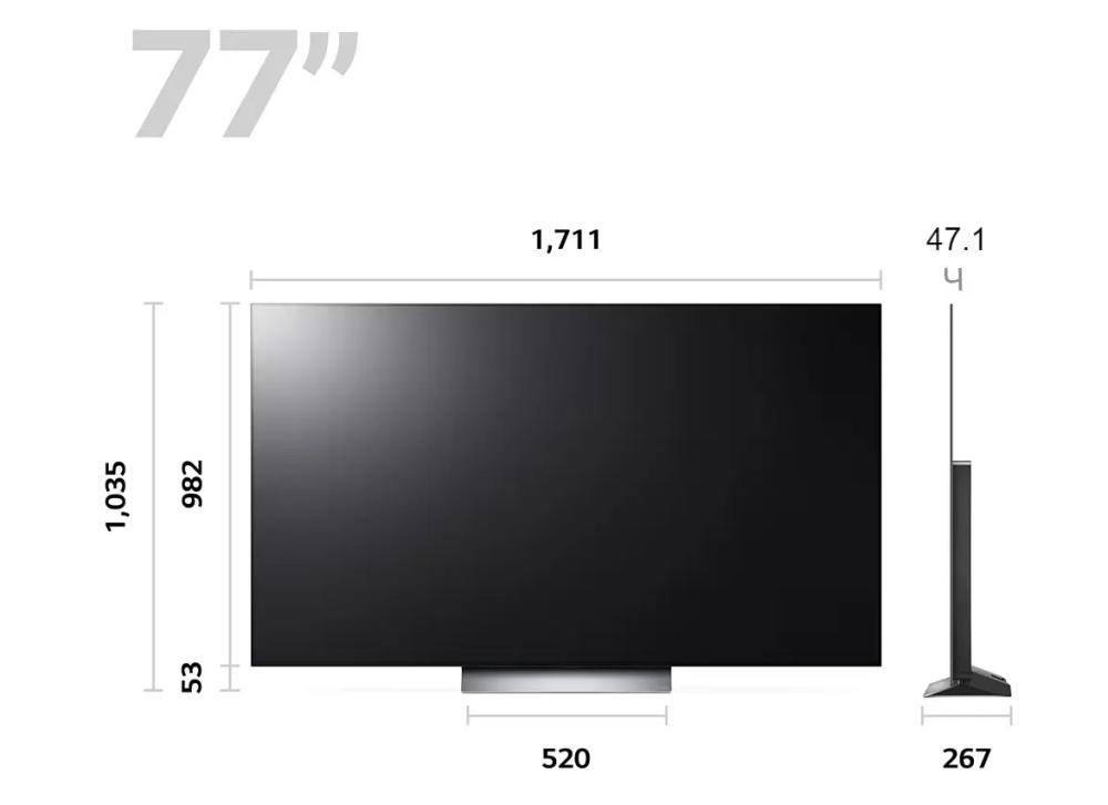 Телевизор LG OLED77C3 отличается ультратонким профилем и аккуратной отделкой корпуса. Глубина 4,7 см делает панель почти невесомой на стене. Узкие рамки создают эффект «безграничного» экрана и помогают полностью погрузиться в изображение. Металлические элементы и матовое антибликовое покрытие добавляют практичности и защищают от отражений и бликов в светлых помещениях.