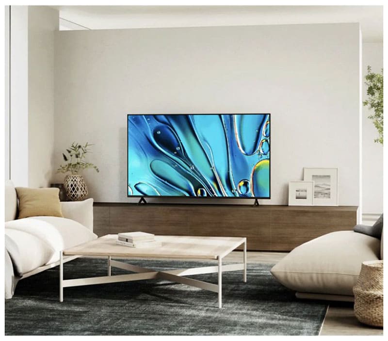 Благодаря крупной диагонали устройство идеально подходит для просторных гостиных, домашних кинотеатров или зон отдыха, где важна полная визуальная иммерсия. Тонкий корпус и минималистичные рамки подчёркивают современный дизайн, позволяя технике гармонично вписываться в любой интерьер — от классического до ультрасовременного.
