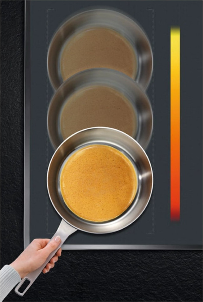 Специальная интеллектуальная система определяет, какие именно катушки располагаются под дном посуды, и подключает именно их. Таким образом для готовки можно использовать посуду не только разного диаметра, но и разной формы. Экономия электроэнергии при этом значительна, ведь конфорка никогда не будет работать при отсутствии посуды, а та часть ее, которая не занята посудой, также останется холодной. Посуду можно устанавливать свободно, произвольно сдвигая ее в пределах зоны нагрева.