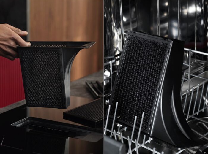 Вытяжка, встроенная в варочную панель — достаточно удобный вариант, позволяющий сэкономить место в кухне. Такая конструкция позволяет лучше улавливать испарения, не давая им распространяться по всему помещению, и способствует более качественной очистке воздуха. Большинство подобных моделей может работать только в режиме рециркуляции воздуха, с удалением капель жира, сажи, неприятных запахов при помощи системы фильтров. Работу в режиме отвода загрязненного воздуха через систему вентиляции организовать довольно сложно, поскольку вытяжка располагается низко над полом. Часто варочная панель находится на кухонном острове, что также мешает присоединению к вентиляции. Еще одна особенность подобных моделей состоит в том, что под варочной панелью нельзя разместить духовку или другую технику, так как место будет занято.