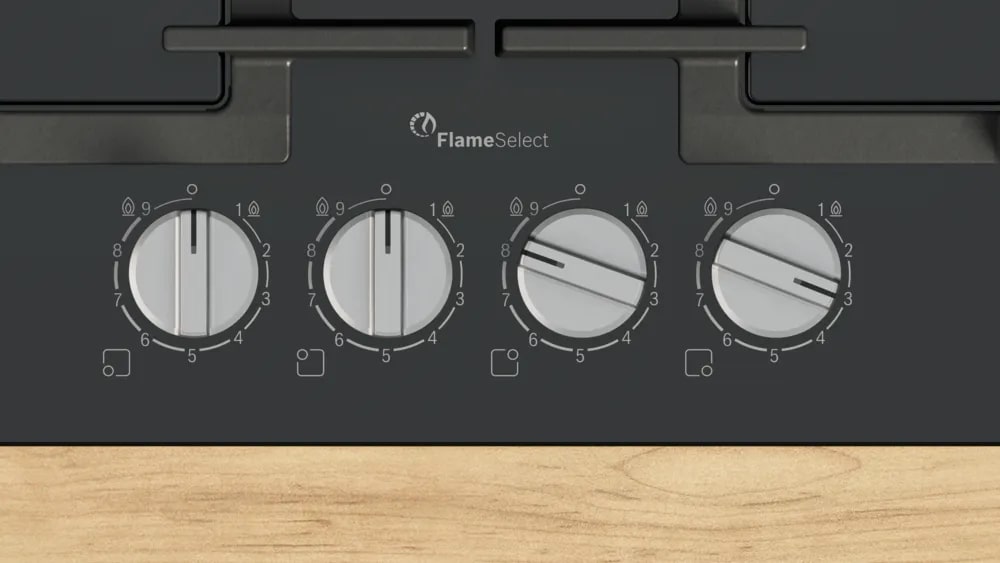Технология FlameSelect в современных газовых варочных панелях Bosch обеспечивает ступенчатую регулировку пламени на 9 предустановленных уровнях. Конфорки с FlameSelect позволяют точно задавать интенсивность нагрева поворотом специального переключателя, не требуя визуального контроля.
