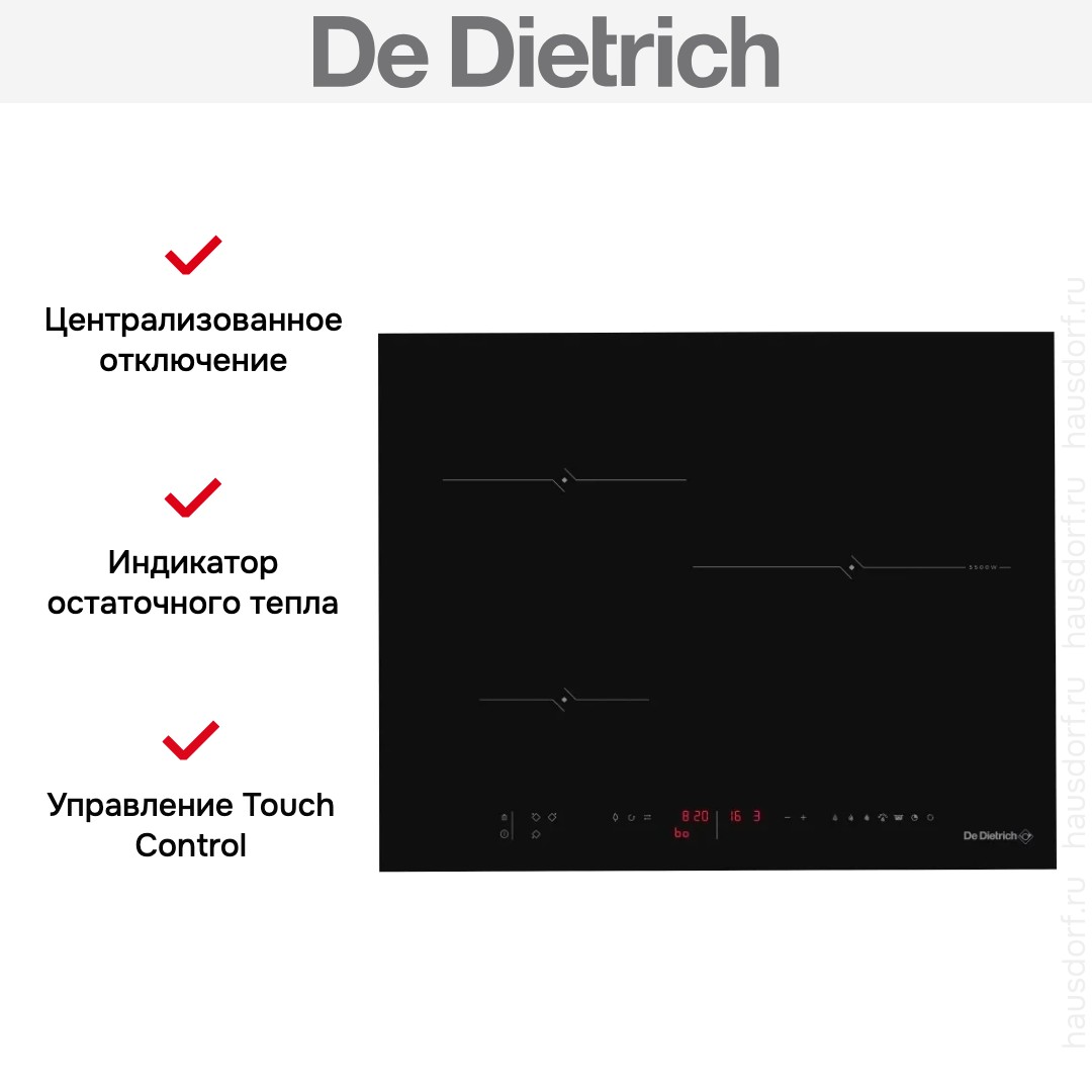 Варочная панель De Dietrich DPI4301BP — это изысканное индукционное устройство из коллекции Philharmonie, сочетающее в себе элегантный дизайн, передовые технологии и высокую функциональность. Модель выполнена в глубоком чёрном цвете и имеет безрамочную поверхность, что придаёт ей цельный, минималистичный и современный вид, гармонично дополняющий любые интерьерные решения. Благодаря независимой установке и электрическому подключению панель работает автономно, обеспечивая мгновенный, точный и энергоэффективный нагрев. Её компактные размеры — 5,9 см в высоту, 65 см в ширину и 51,5 см в глубину — позволяют легко встроить изделие в стандартную нишу размером 56×49 см, не нарушая целостности кухонного гарнитура. Управление осуществляется с помощью электронной сенсорной системы TouchControl с фронтальным расположением элементов и цифровым дисплеем, отображающим текущие параметры. Такой подход обеспечивает интуитивно понятную настройку зон нагрева и упрощает уход за поверхностью. Каждая конфорка оснащена индивидуальным таймером с возможностью установки времени от 1 до 99 минут, что позволяет точно контролировать процесс приготовления нескольких блюд одновременно. Индикатор остаточного тепла визуально предупреждает о том, что поверхность горячая, после выключения прибора, повышая безопасность эксплуатации. Индукционная технология нагревает только дно посуды, оставляя окружающую зону прохладной. Это не только снижает риск ожогов, но и экономит электроэнергию. Высокая мощность, равномерное распределение тепла и продуманная эргономика делают эту модель идеальной как для повседневной готовки, так и для сложных кулинарных задач. Панель сочетает в себе премиальное качество сборки, инновационные функции и безупречный внешний вид, подчёркивая высокий статус владельца и его стремление к совершенству на кухне.