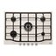 Выбор газовой варочной панели чаще всего обусловлен тем, что в частный дом или квартиру проведен именно газ в качестве обогрева. Работать с этой моделью довольно просто, так как мощность нагрева видна невооруженным взглядом — по силе огня в горелке. Количество конфорок в этой модели: 5. Горелки с тройной короной имеют несколько ступеней нагрева — в зависимости от них образуется несколько кругов пламени.
