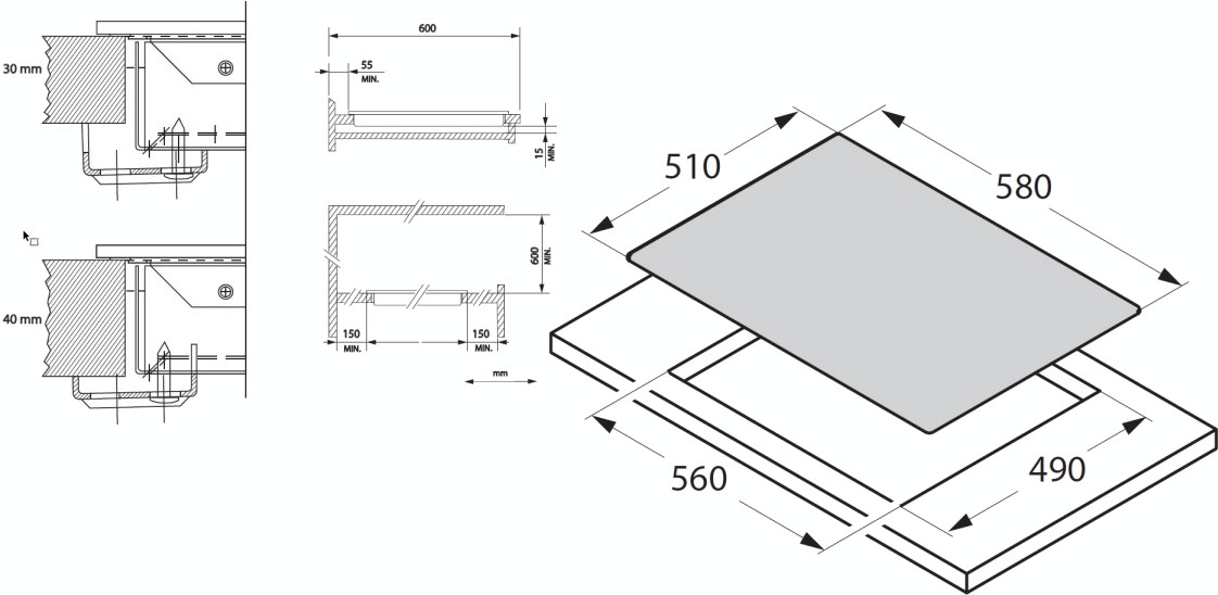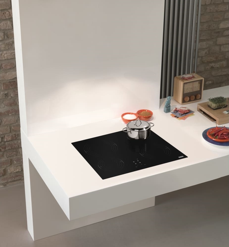 Электрические и индукционные варочные панели из стали, эмали и стеклокерамики имеют толщину от 4 до 5,5 cм, но выглядят более низкими, так как на них отсутствуют выступающие горелки. Как правило, подробные требования к толщине столешницы для установки приводятся в руководстве пользователя.