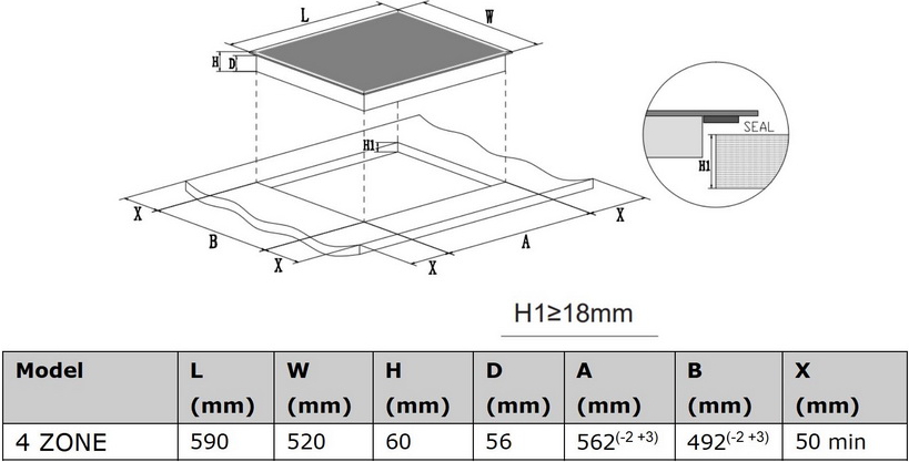 Это независимая индукционная поверхность шириной 59 см, соответствующая стандартным габаритам кухонных модулей. Для встраивания требуется ниша размером 56×49 см, а высота корпуса всего 6 см обеспечивает плотную и аккуратную интеграцию в столешницу. Благодаря индукционной технологии нагрев происходит мгновенно и исключительно в нижней части совместимой посуды, что повышает энергоэффективность, сокращает время приготовления и гарантирует безопасность: стеклокерамика за пределами активной зоны остаётся относительно прохладной.