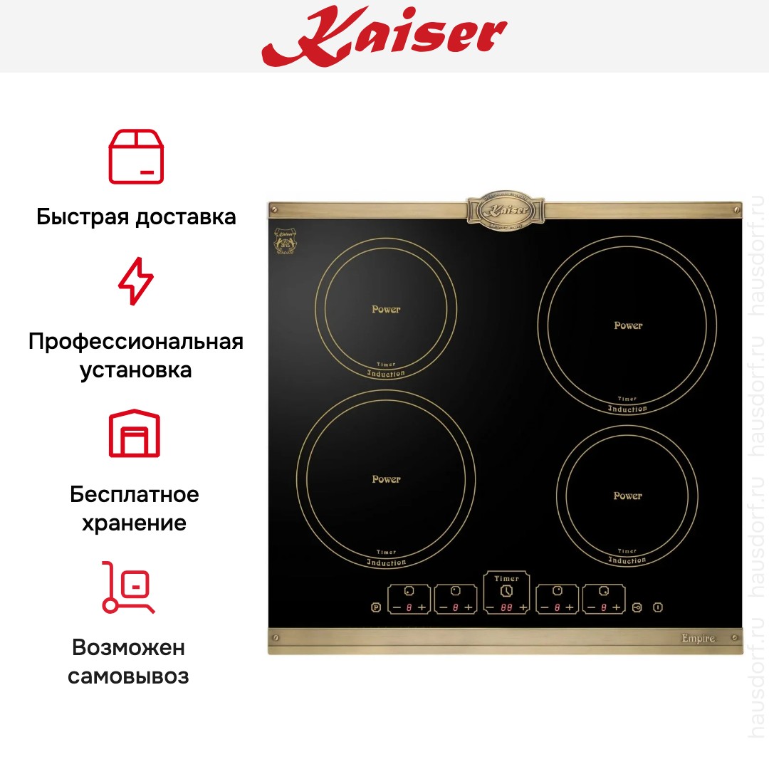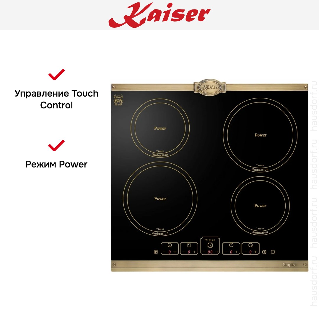 Варочная панель Kaiser KCT 6195 IEm — индукционная поверхность в стиле Retro. Глубокий черный оттенок подчеркивают металлическая рамка и бронзовая фурнитура. Фронтально расположенные сенсоры и цифровой дисплей обеспечивают ясную индикацию и уверенное управление.