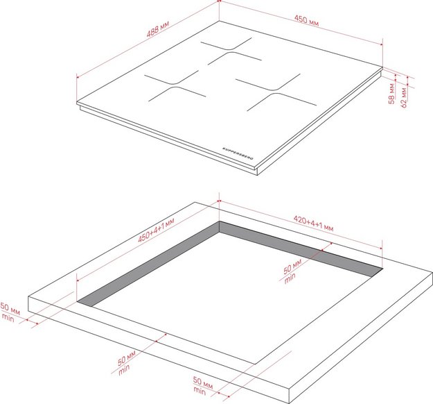 Отверстие в нише выполняют, исходя из размеров самой варочной панели — они должны соответствовать друг другу либо немного превышать размеры выреза. При выборе наиболее распространенной варочной панели с 4 конфорками в столешнице вырезается отверстие шириной 59 см и глубиной около 49-50 см. Толщина столешницы должна быть немного меньше, чем высота варочной панели, в противном случае панель придется заглубить, чтобы она не слишком выступала.