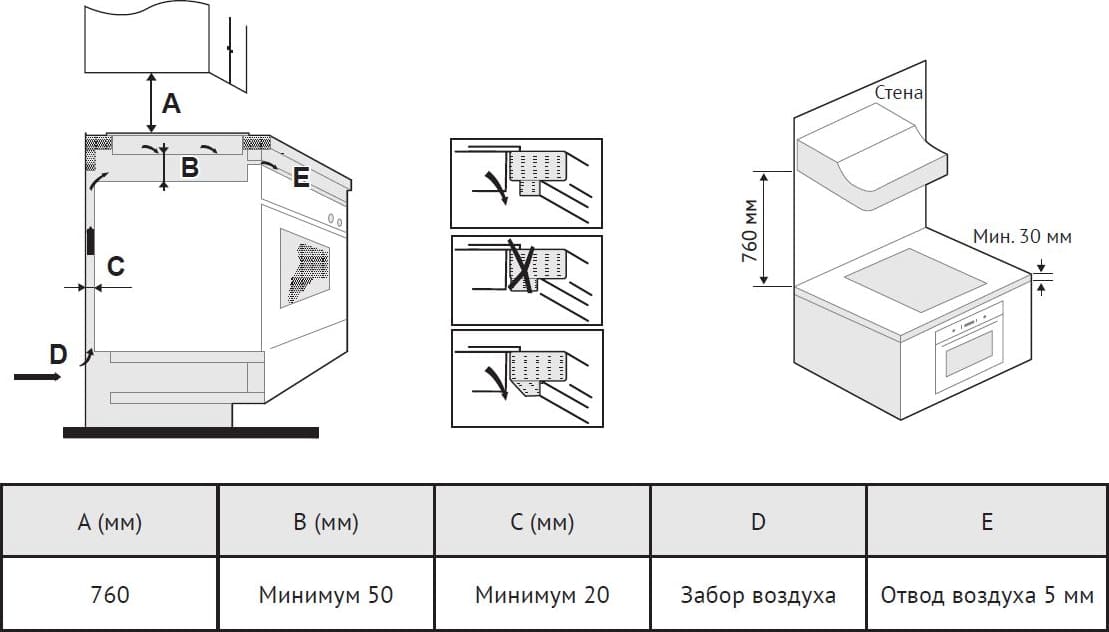 Также опасно устанавливать варочную панель вплотную к холодильнику или шкафу: следует оставить между ними расстояние не менее 30 см. Зазор между задней стороной варочной панели и стенкой кухни составляет обычно не менее 50 см для электрических панелей и 70 см — для газовых. Иногда стену кухни защищают огнеупорной панелью.