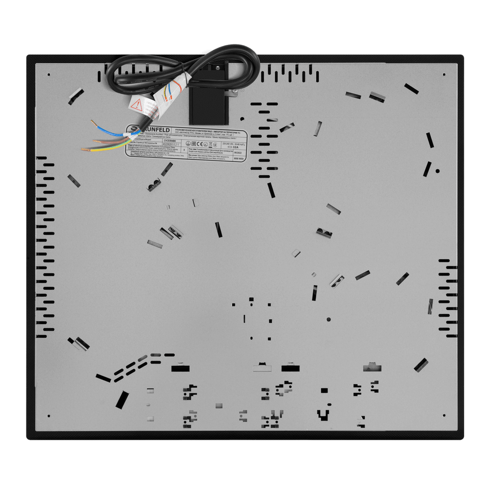 Материалы: рабочая поверхность изготовлена из стеклокерамики — гладкого, термостойкого сплава стекла и керамических добавок, устойчивого к прямому нагреву зон Hi‑Light. Сенсорные переключатели интегрированы в стеклокерамическую панель и функционируют за счет электронного блока управления, что исключает механический износ кнопок. Общий вес устройства 7.5 кг (в упаковке 8.5 кг), конструкция рассчитана на накладной монтаж и сертифицирована по европейскому стандарту CE.
