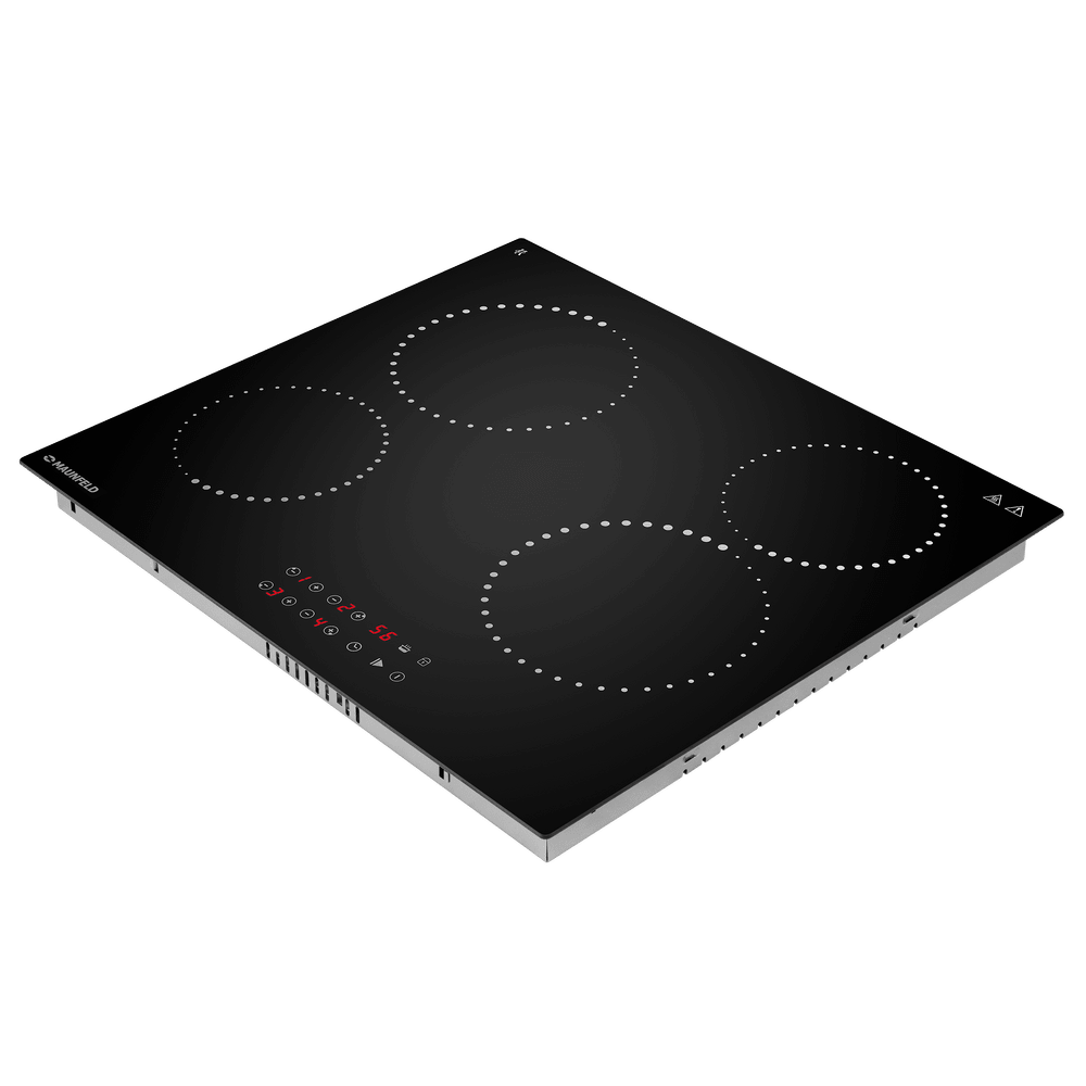 Выглядит как сдержанная и элегантная варочная панель черного цвета с низким профилем: габариты 5.2×59×52 см создают компактный силуэт, который легко впишется в кухонную поверхность. Рабочая зона выполнена в виде единой стеклокерамической плоскости, а элементы управления расположены спереди — сенсорные TouchControl-переключатели аккуратно встроены в переднюю часть, обеспечивая плавный доступ к функциям без выступающих ручек. Четыре зоны нагрева расставлены симметрично, две из них диаметром 200 мм и две по 165 мм, что дает визуально уравновешенную композицию.