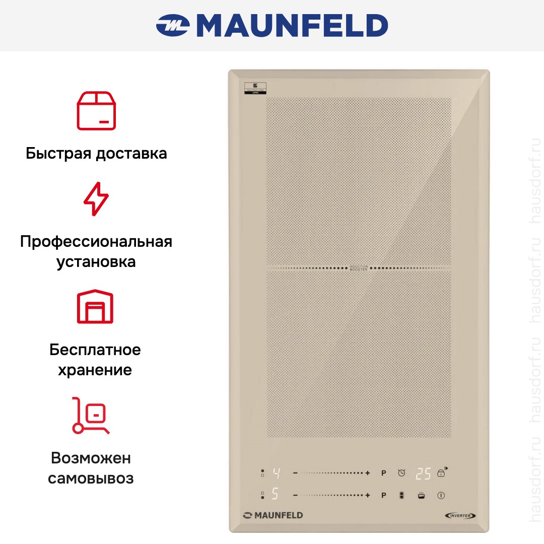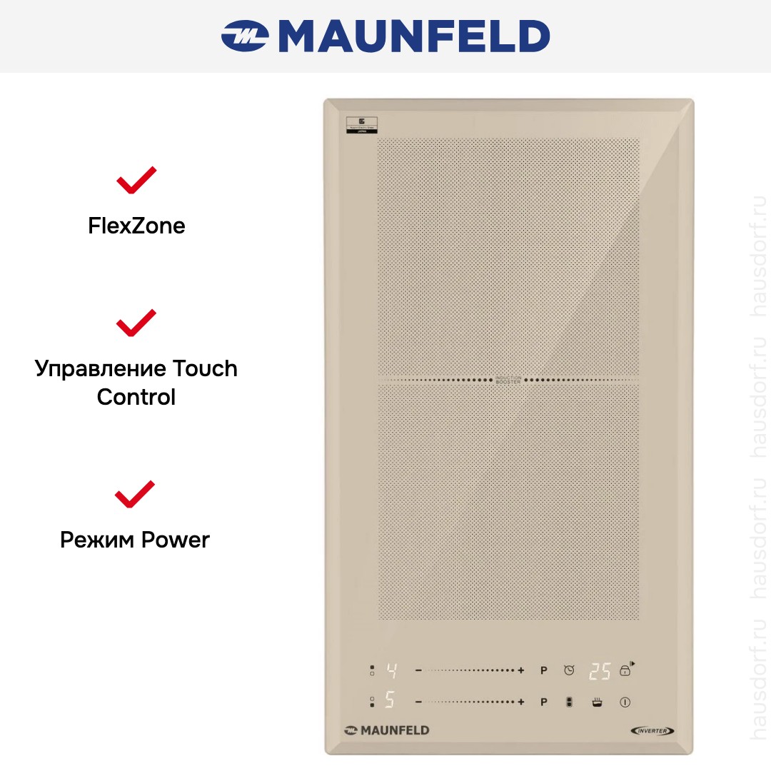 Индукционная варочная панель Maunfeld CVI292S2FBG LUX INVERTER создана для тех, кто ценит лаконичность и продуманную эргономику на кухне: тонкий корпус высотой 5.5 см и компактная ширина 29 см при глубине 52 см позволяет вписать прибор даже в ограниченное пространство, ниша для встраивания требует посадки 26.5×49 см, а накладной монтаж делает монтаж быстрым и простым. Бежевая стеклокерамическая поверхность придаёт интерьеру мягкую, уютную нотку, при этом материал отличается стойкостью к теплу и лёгкостью в уходе. Две индукционные зоны диаметром 190×190 мм каждая обеспечивают быстрый разогрев за счёт детектирования посуды: плита автоматически определяет диаметр ёмкости и концентрирует энергию именно под дном, что повышает КПД и экономит электроэнергию. Мощность передней зоны — 1,5 кВт, задней — 2 кВт с режимом Booster для кратковременного увеличения интенсивности нагрева, а девятиступенчатая регулировка позволяет точно выставить температуру под разные рецепты. Управление выполнено в электронном варианте с фронтальным расположением сенсорных переключателей TouchControl: панель откликается легко и отзывчиво, таймер с функцией паузы даёт возможность отложить отключение или приостановить процесс приготовления без потери настроек. Безопасность представлена блокировкой от детей, защитой от перегрева и автоматическим отключением при необходимости, а длина кабеля 105 см упрощает подключение к сети 220-240 В, 50 Гц. Конструкция отличается малым весом — чистый вес 4.34 кг (брутто 4.98 кг), что облегчает транспортировку и установку. Дополнительная гибкость обеспечивается одной расширенной зоной Flex Zone, которая адаптируется под нестандартные по диаметру ёмкости, расширяя функционал компактного модуля. Эта модель подходит для тех, кто ищет комбинацию эстетики и технологичности: минималистичный дизайн сочетается с удобной работой сенсоров, продуманной геометрией конфорок и набором практичных опций, необходимых в повседневной кухонной рутине; артикул КА-00022414.