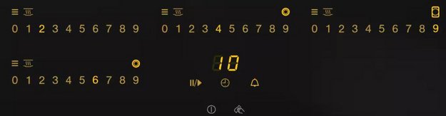 Для каждой конфорки предусмотрен также индикатор уровня мощности: он показывает, какова интенсивность нагрева в конкретный момент. Если в данной модели имеется таймер, специальный индикатор указывает, сколько времени осталось до окончания приготовления или прошло с начала работы, дополнительно может также выдаваться сообщение о том, включен ли звуковой сигнал. Индикаторы активации различных опций могут оповещать о включении режимов оттаивания, подогрева, об активации функции паузы, автоматики жарения и закипания, функции временного увеличения мощности, о блокировке панели управления от детей.