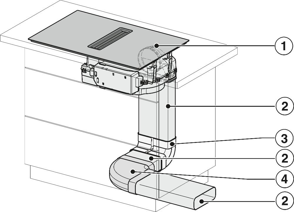 Вытяжка, встроенная в варочную панель — достаточно удобный вариант, позволяющий сэкономить место в кухне. Такая конструкция позволяет лучше улавливать испарения, не давая им распространяться по всему помещению, и способствует более качественной очистке воздуха. Большинство подобных моделей может работать только в режиме рециркуляции воздуха, с удалением капель жира, сажи, неприятных запахов при помощи системы фильтров. Работу в режиме отвода загрязненного воздуха через систему вентиляции организовать довольно сложно, поскольку вытяжка располагается низко над полом. Часто варочная панель находится на кухонном острове, что также мешает присоединению к вентиляции. Еще одна особенность подобных моделей состоит в том, что под варочной панелью нельзя разместить духовку или другую технику, так как место будет занято.