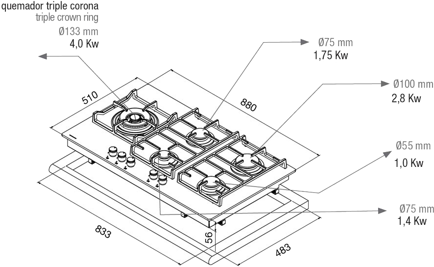 В среднем у газовых моделей этот показатель больше, чем у электрических. Высота газовых варочных поверхностей составляет обычно от 4 до 10 см: важное значение при выборе модели имеет и толщина столешницы. Известно, что стандартная толщина столешницы из ДВП составляет около 38 мм: исходя из этого, высота газовых варочных панелей чаще всего составляет 4–5 см. Если варочная панель имеет большую высоту, ее обычно заглубляют в столешницу, стараясь при этом не повреждать внутреннюю сторону. Для этого под ней устанавливают дополнительную полку (фальшпанель), за счет которой уменьшается пространство в тумбе.