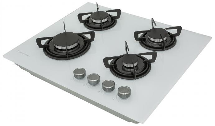 Цвет — белый. Благодаря отсутствию рамки она отлично впишется в интерьер и не займет лишнее место на столешнице, которое можно использовать для работы. Открытый огонь не страшен ни вашей посуде, ни вам, так как горелки надежно закрыты решетками. Материал самой поверхности: закаленное стекло. Управление этой моделью механическое. Для переключения уровней нагрева, выбора функций используются следующие переключатели: поворотные. Простая система контроля за прибором делают его более универсальным, ведь разобраться сможет кто угодно.