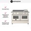 Устройства с тремя духовками также имеют один основной и две дополнительных шкафа разного объема: например, плиты Bertazzoni оснащены большой духовкой объемом 69 литров, средней объемом 54 литра и малой объемом 24 литра. Духовки располагаются в два ряда: две меньшие духовки в одном ряду, большая и ящик для посуды в другом.