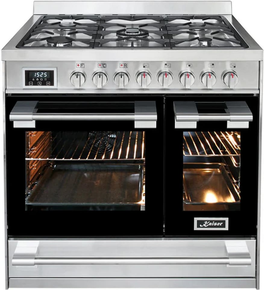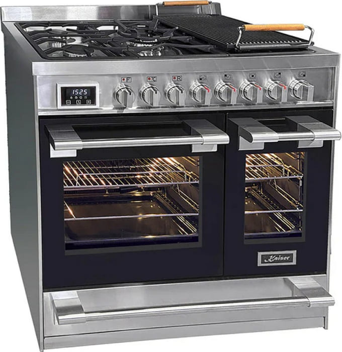 Устройства с тремя духовками также имеют один основной и две дополнительных шкафа разного объема: например, плиты Bertazzoni оснащены большой духовкой объемом 69 литров, средней объемом 54 литра и малой объемом 24 литра. Духовки располагаются в два ряда: две меньшие духовки в одном ряду, большая и ящик для посуды в другом.