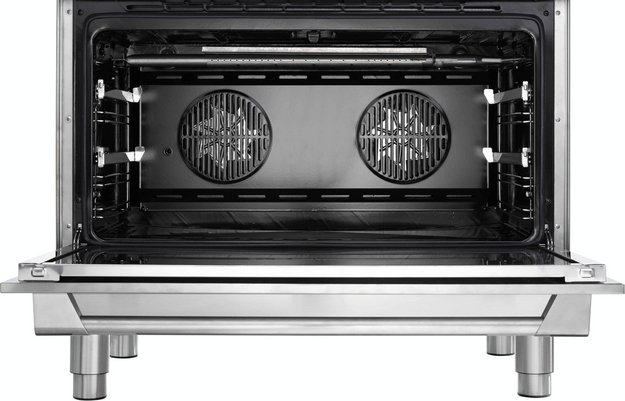 Устройства с тремя духовками также имеют один основной и две дополнительных шкафа разного объема: например, плиты Bertazzoni оснащены большой духовкой объемом 69 литров, средней объемом 54 литра и малой объемом 24 литра. Духовки располагаются в два ряда: две меньшие духовки в одном ряду, большая и ящик для посуды в другом.