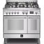 Устройства с тремя духовками также имеют один основной и две дополнительных шкафа разного объема: например, плиты Bertazzoni оснащены большой духовкой объемом 69 литров, средней объемом 54 литра и малой объемом 24 литра. Духовки располагаются в два ряда: две меньшие духовки в одном ряду, большая и ящик для посуды в другом.