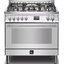 Устройства с тремя духовками также имеют один основной и две дополнительных шкафа разного объема: например, плиты Bertazzoni оснащены большой духовкой объемом 69 литров, средней объемом 54 литра и малой объемом 24 литра. Духовки располагаются в два ряда: две меньшие духовки в одном ряду, большая и ящик для посуды в другом.
