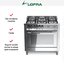 Устройства с тремя духовками также имеют один основной и две дополнительных шкафа разного объема: например, плиты Bertazzoni оснащены большой духовкой объемом 69 литров, средней объемом 54 литра и малой объемом 24 литра. Духовки располагаются в два ряда: две меньшие духовки в одном ряду, большая и ящик для посуды в другом.