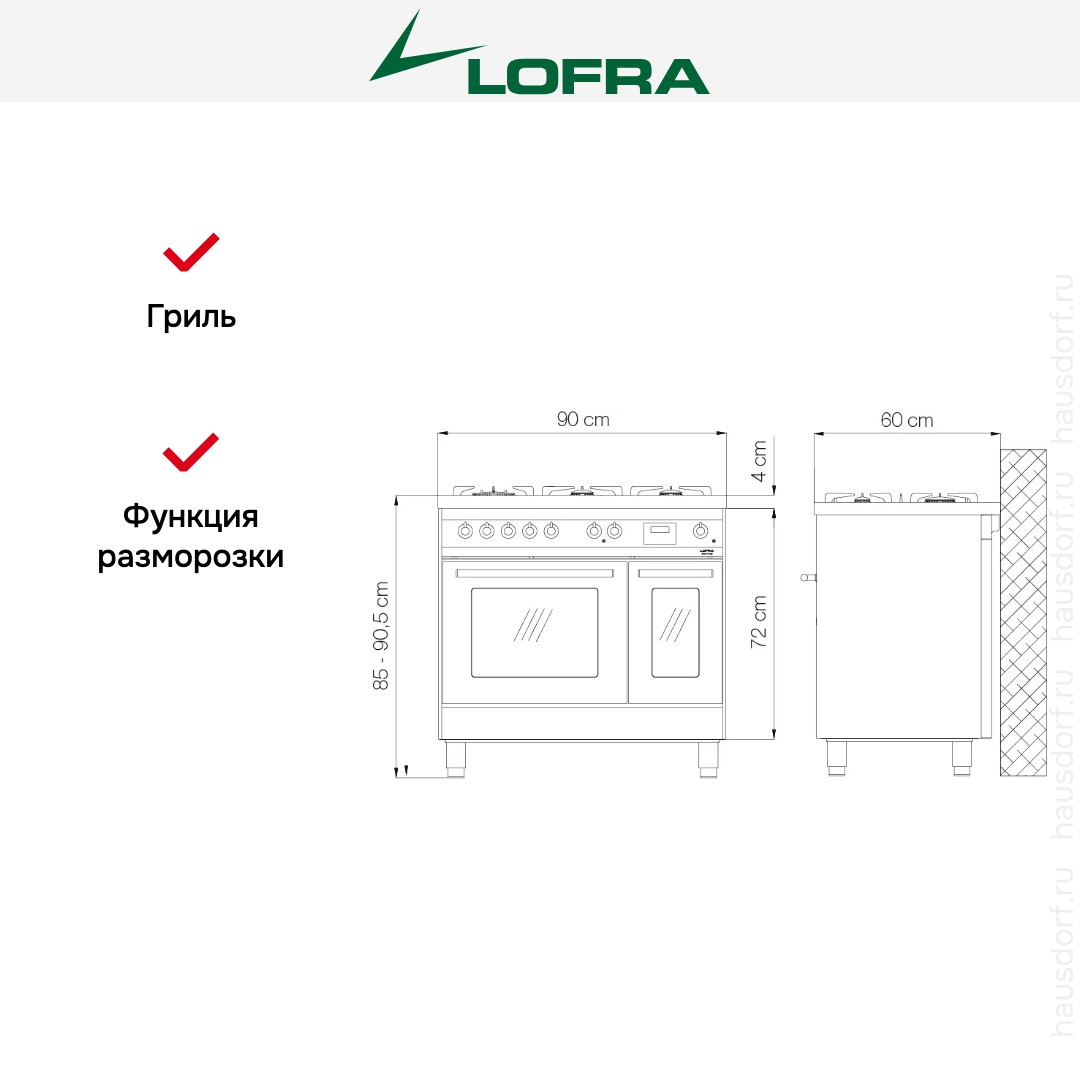 Габариты устройства — от 85 до 90,5 см в высоту, 90 см в ширину и 60 см в глубину — позволяют органично встроить технику в просторные интерьеры, не нарушая баланса пропорций. Подключение к газовой магистрали и электросети гарантирует стабильную работу всех систем, включая электронные таймеры, защиту от перегрева и блокировку панели от случайного включения.